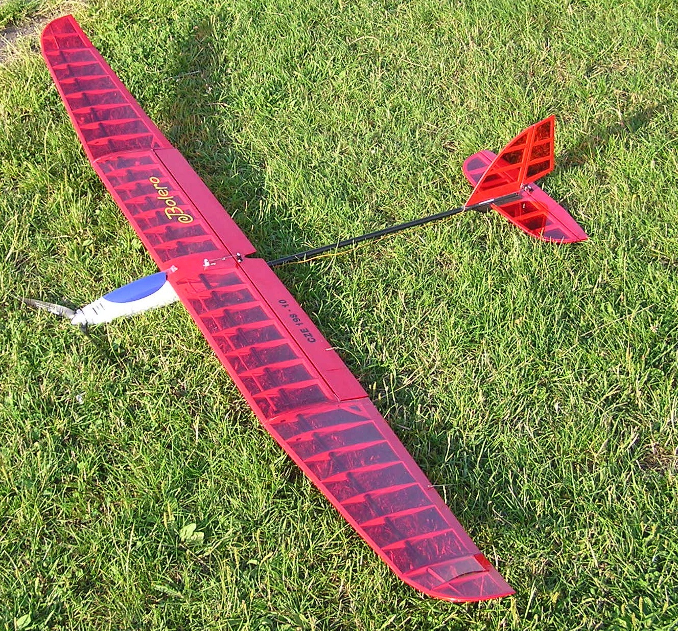 | konstrukce: celobalzová křídla a ocasní plochy potaženy nažehlovací folíi. Konstruktér Luboš Rezler |
